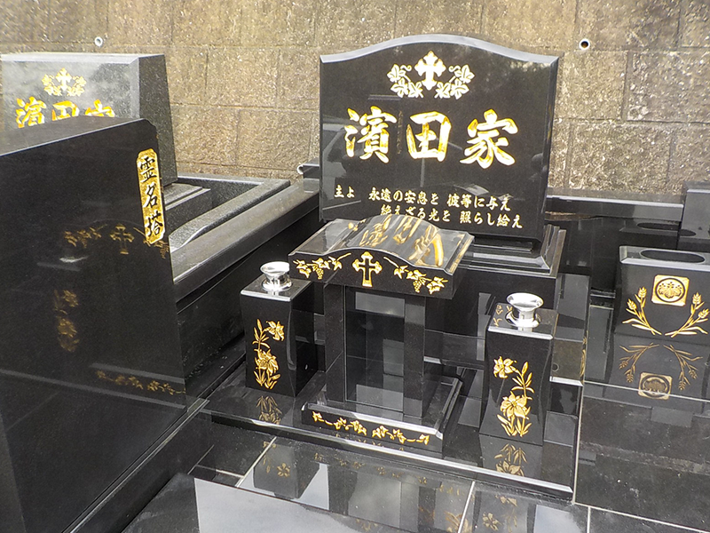 十字架を彫刻するのが象徴的でデザインは横型が多く、マリア様を設置することもあります。