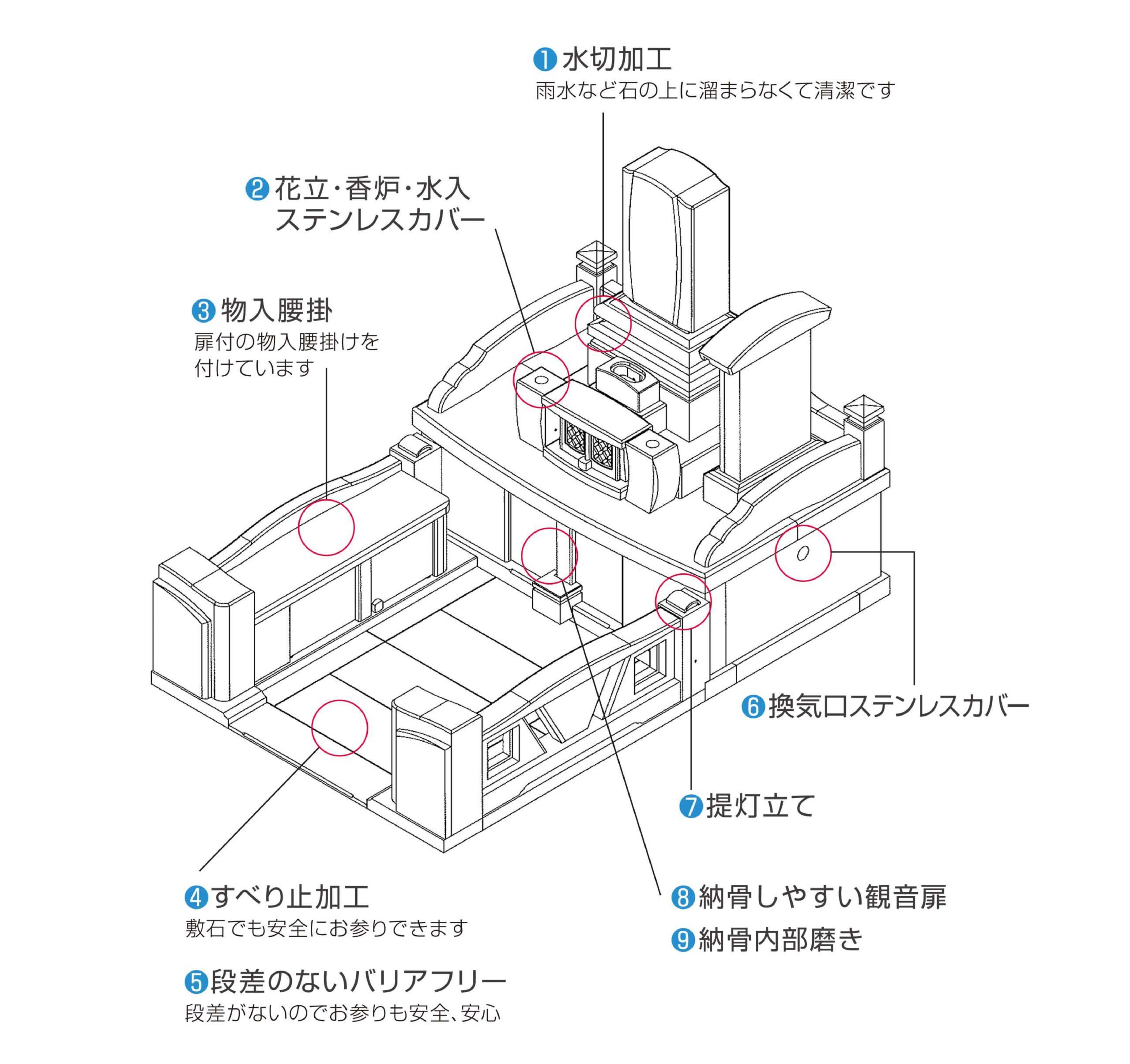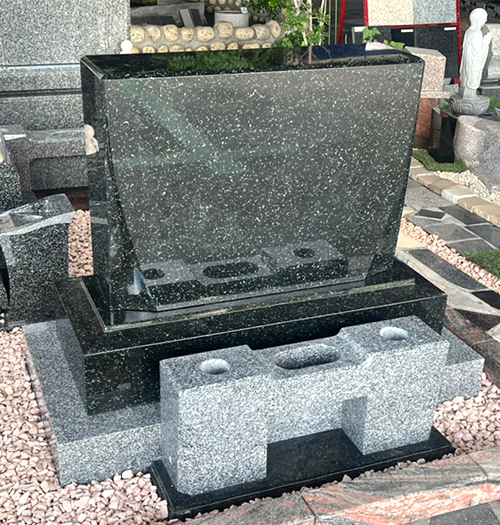 石 種: 棹石/ アーバングレー(印度産) 挟石/ アーバングレー(印度産) 上台・中台/大島石(日本) 受鉢/バイオレットブルー(ウルグアイ) 香炉/印度天山(印度産) 花立/印度天山(印度産) 拝石/ベルガム(印度産)